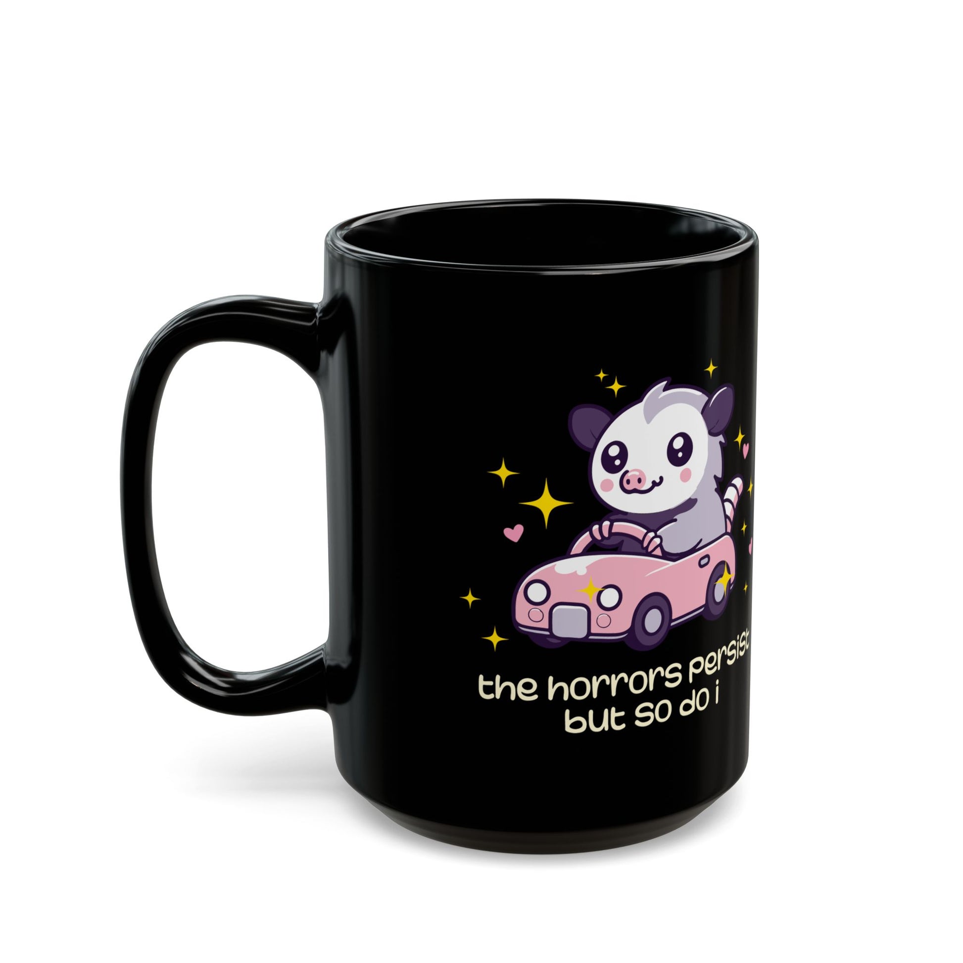 The Horrors Persist But So Do I is the ultimate chaos gremlin energy in ceramic form. Featuring an adorable possum behind the wheel of a pink car, this mug screams "I’m unwell, but I’m still going to work because I like snacks and have bills." Whether you’re sipping anxiety tea, coping coffee, or just vibing through the existential dread, this mug is here for you—glittery stars, pastel hearts, and all. A must-have for survivors of Mondays and lovers of unhinged cuteness.