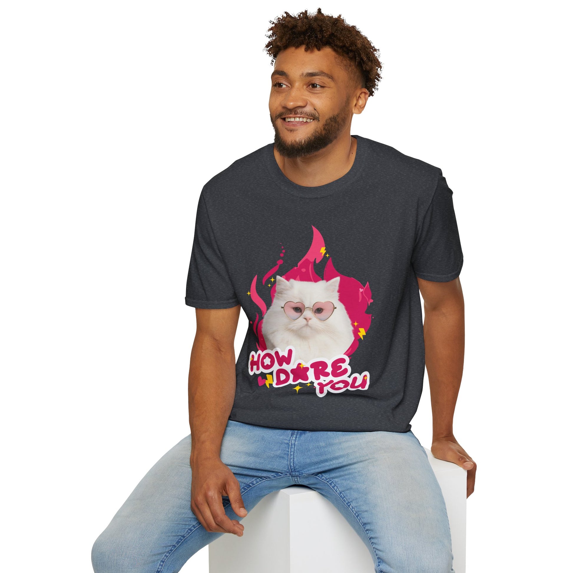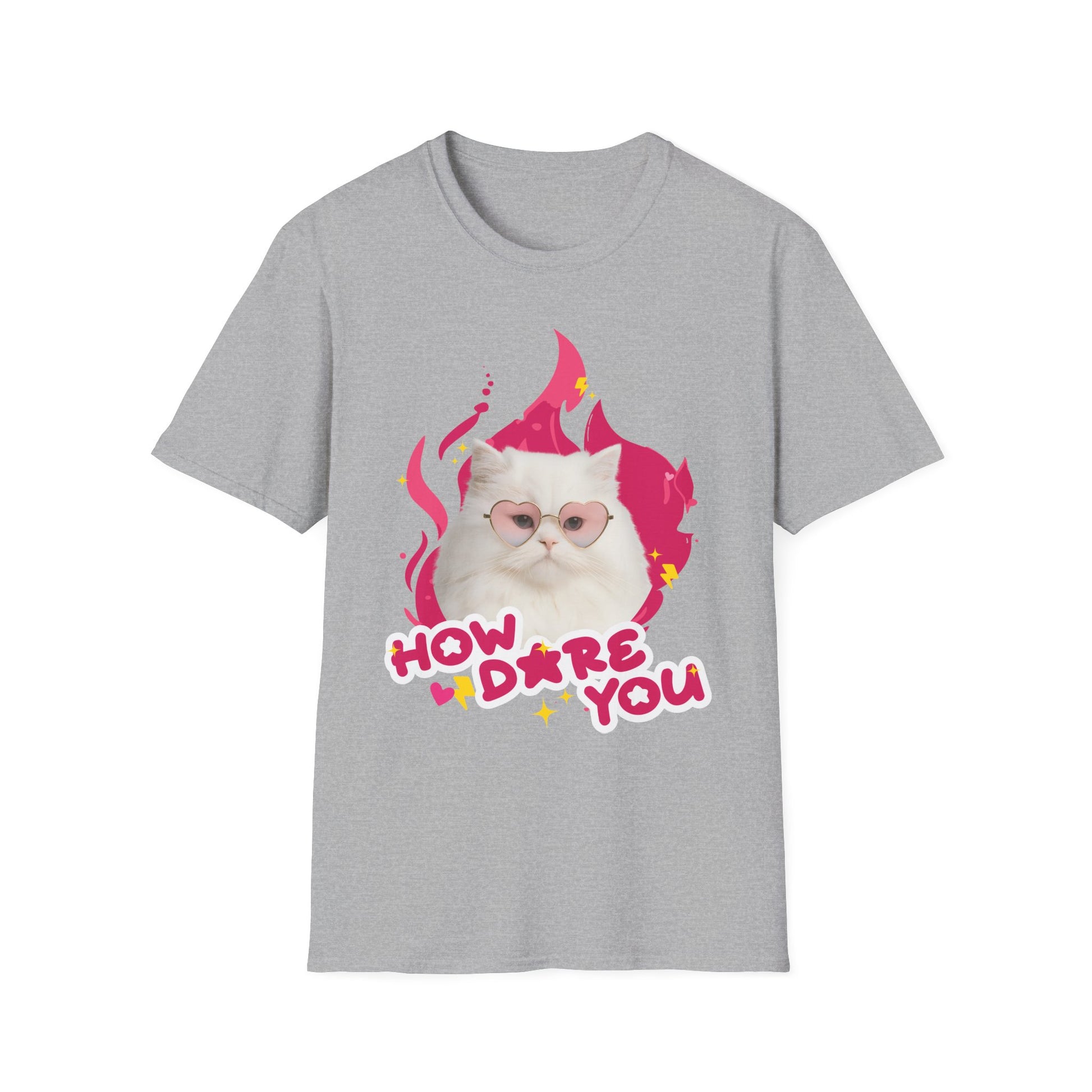 Bring the drama everywhere with this “How Dare You” cat tee—fluffy white kitty in pink heart shades, serving pure attitude with flames in the background. Printed on a soft, comfy unisex tee that’s perfect for everyday wear, this shirt is all about bold vibes and big side-eye energy. Dress it up with a jacket or rock it casual—either way, the sass goes with everything.