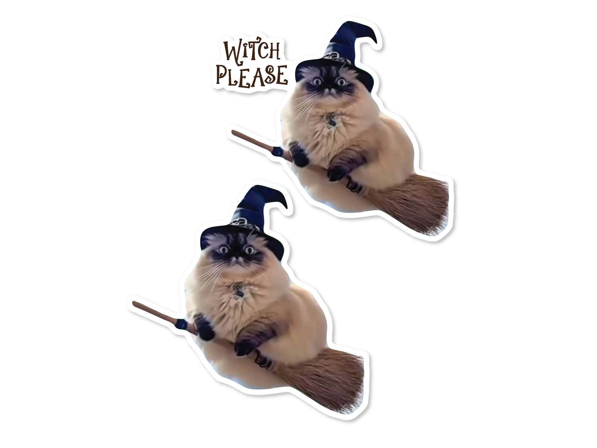 This fluffy broom-riding cat is here to put the “sass” in “sorceress.” Choose between the classic witch cat on a broom or the full “Witch Please” version for extra broomstick attitude. Each sticker is 3 inches of mystical mischief—perfect for laptops, water bottles, or spell books.